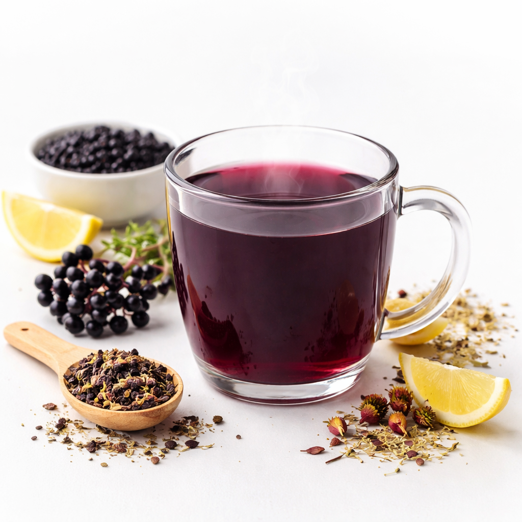 Observed benefits: Elderberry and rose hips offer vitamin Cβrich, antioxidant support, while echinacea is traditionally used to encourage seasonal wellness. Ginger root provides warming comfort and vitality, while peppermint and lemongrass help refresh and soothe the senses. Hibiscus and orange peel add a bright, citrusy lift, and dandelion root with burdock root support gentle balance and grounding.